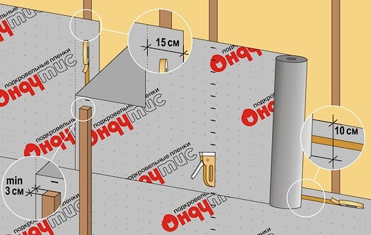 Нахлест горизонтальных стыков не менее 15 см, вертикальных — не менее 20 см. Вертикальные стыки плёнки приходятся на стропила.