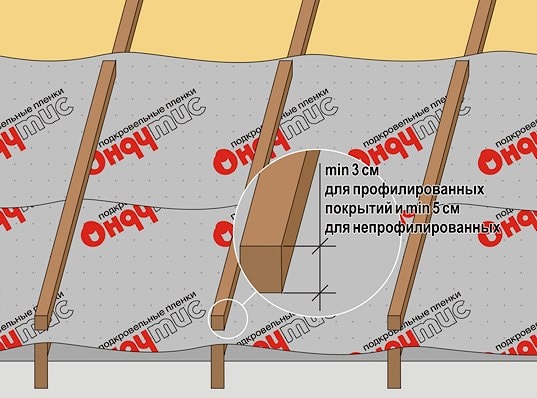 Закрепите Ондутис A100 по стропилам антисептированными брусками высотой минимум 3 см. После чего приступайте к монтажу нужной для вашей кровли обрешетки.