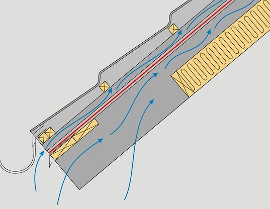 Подкровельное пространство должно вентилироваться. Для этого в подшивке карниза и в зоне конька предусматриваются вентиляционные отверстия для доступа внешнего воздуха. В случае если высота стропильной ноги равна толщине утеплителя и не позволяет устроить нижний вентиляционный зазор, закрепите сверху на стропильной ноге брусок 5х5 см или смонтируйте один слой теплоизоляции под стропилами.