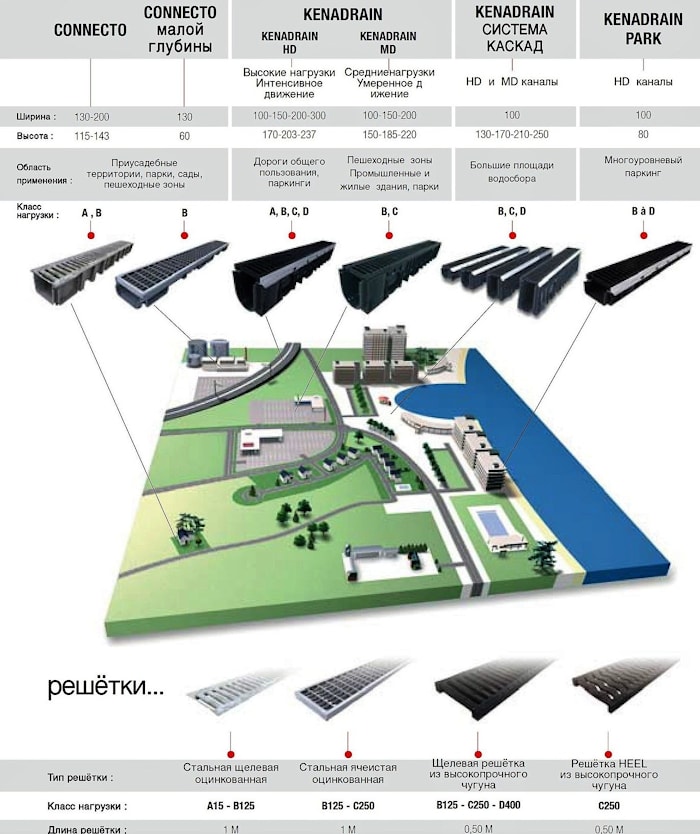 - каналы водоотводные для поверхностного отвода ливневых вод класс А15 (для пешеходной зоны) DRP178 с решетками из гальванизированной стали 10АНР с решетками из ПВХ и др.